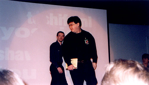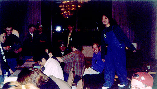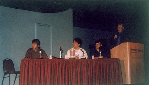 Opening Ceremonies! It's Part One of our Japanese Guests, (L-R) Tsukasa Kotobuki, Kenichi Sonoda and Yuji Moriyama. At the mike? That's Emcee of Emcees, Carl Horn. |